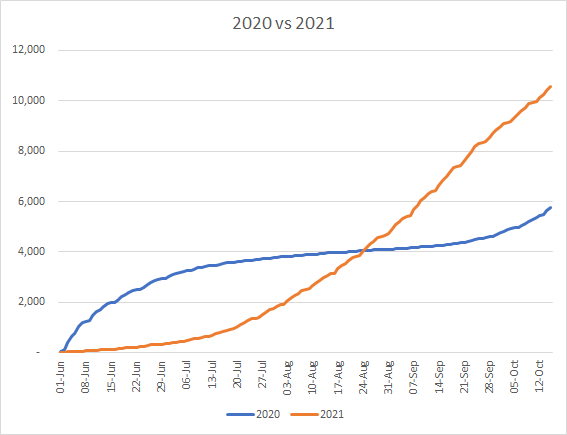 Since i last posted in July, things have continued to get more and more ridiculous. Precautions have been thrown to the wind, most people are taking little or none, and as a consequence cases have rocketed to 50,000 a day. Deaths have not risen as fast but are running at 150-200 a day. Over ten thousand people have died since “freedom day”, and the death toll is actually worse than last year. 327,000 cases in the last week, 912 deaths, 6000 hospitalised. All about 10% up on the previous week.